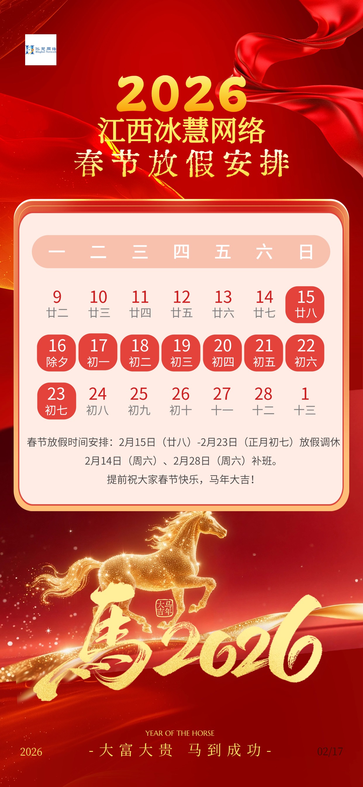 江西冰慧网络2026年春节放假安排